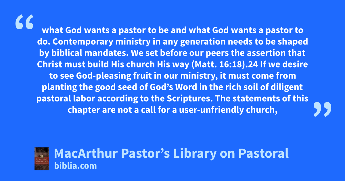 what God wants a pastor to be and what God wants a pastor to do. Contemporary ministry in any generation needs to be shaped by biblical mandates. We set before our peers the assertion that Christ must build His church His way (Matt. 16:18).24 If we desire to see God-pleasing fruit in our ministry, it must come from planting the good seed of God’s Word in the rich soil of diligent pastoral labor according to the Scriptures. The statements of this chapter are not a call for a user-unfriendly church,