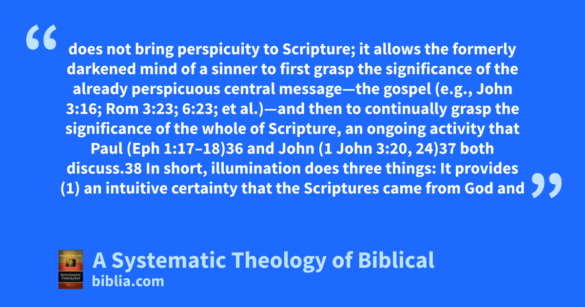 does not bring perspicuity to Scripture; it allows the formerly darkened mind of a sinner to first grasp the significance of the already perspicuous central message—the gospel (e.g., John 3:16; Rom 3:23; 6:23; et al.)—and then to continually grasp the significance of the whole of Scripture, an ongoing activity that Paul (Eph 1:17–18)36 and John (1 John 3:20, 24)37 both discuss.38 In short, illumination does three things: It provides (1) an intuitive certainty that the Scriptures came from God and
