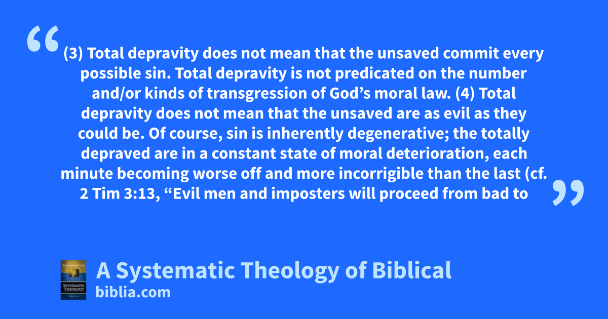 (3) Total depravity does not mean that the unsaved commit every possible sin. Total depravity is not predicated on the number and/or kinds of transgression of God’s moral law. (4) Total depravity does not mean that the unsaved are as evil as they could be. Of course, sin is inherently degenerative; the totally depraved are in a constant state of moral deterioration, each minute becoming worse off and more incorrigible than the last (cf. 2 Tim 3:13, “Evil men and imposters will proceed from bad to