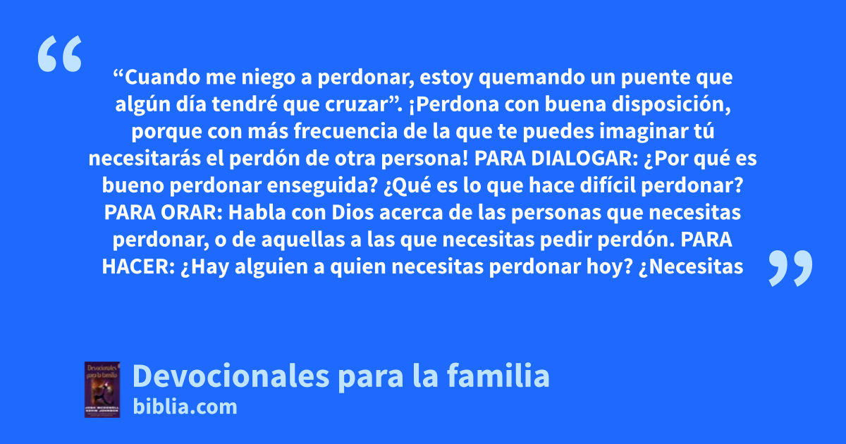 “Cuando me niego a perdonar, estoy quemando un puente que algún día tendré que cruzar”. ¡Perdona con buena disposición, porque con más frecuencia de la que te puedes imaginar tú necesitarás el perdón de otra persona! PARA DIALOGAR: ¿Por qué es bueno perdonar enseguida? ¿Qué es lo que hace difícil perdonar? PARA ORAR: Habla con Dios acerca de las personas que necesitas perdonar, o de aquellas a las que necesitas pedir perdón. PARA HACER: ¿Hay alguien a quien necesitas perdonar hoy? ¿Necesitas