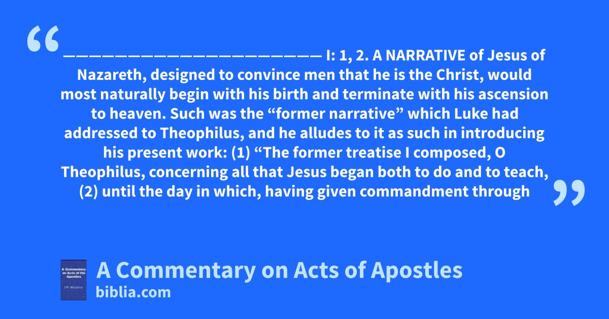 ———————————————————— I: 1, 2. A NARRATIVE of Jesus of Nazareth, designed to convince men that he is the Christ, would most naturally begin with his birth and terminate with his ascension to heaven. Such was the “former narrative” which Luke had addressed to Theophilus, and he alludes to it as such in introducing his present work: (1) “The former treatise I composed, O Theophilus, concerning all that Jesus began both to do and to teach, (2) until the day in which, having given commandment through