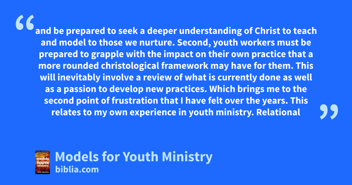 and be prepared to seek a deeper understanding of Christ to teach and model to those we nurture. Second, youth workers must be prepared to grapple with the impact on their own practice that a more rounded christological framework may have for them. This will inevitably involve a review of what is currently done as well as a passion to develop new practices. Which brings me to the second point of frustration that I have felt over the years. This relates to my own experience in youth ministry. Relational
