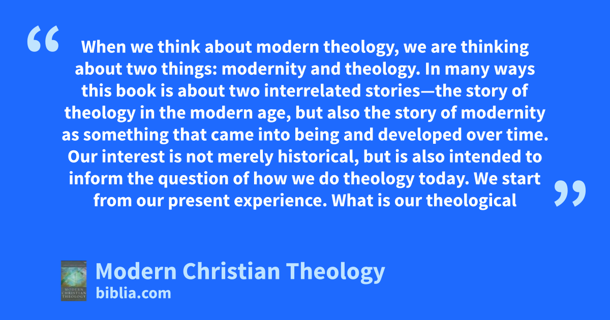 When we think about modern theology, we are thinking about two things: modernity and theology. In many ways this book is about two interrelated stories—the story of theology in the modern age, but also the story of modernity as something that came into being and developed over time. Our interest is not merely historical, but is also intended to inform the question of how we do theology today. We start from our present experience. What is our theological
