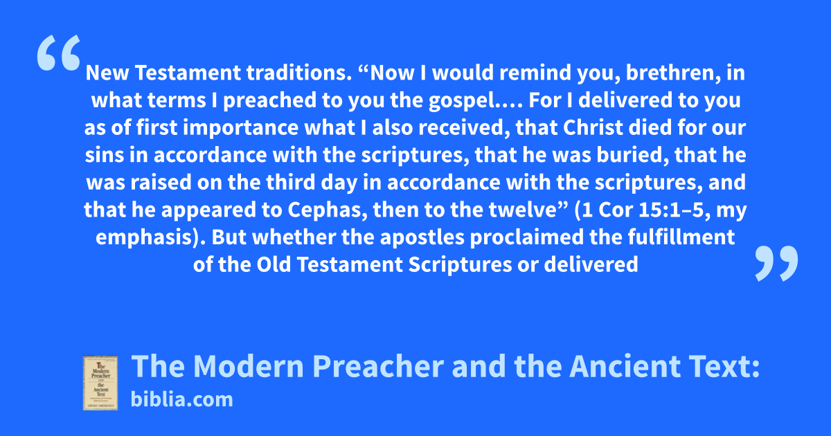 New Testament traditions. “Now I would remind you, brethren, in what terms I preached to you the gospel.… For I delivered to you as of first importance what I also received, that Christ died for our sins in accordance with the scriptures, that he was buried, that he was raised on the third day in accordance with the scriptures, and that he appeared to Cephas, then to the twelve” (1 Cor 15:1–5, my emphasis). But whether the apostles proclaimed the fulfillment of the Old Testament Scriptures or delivered