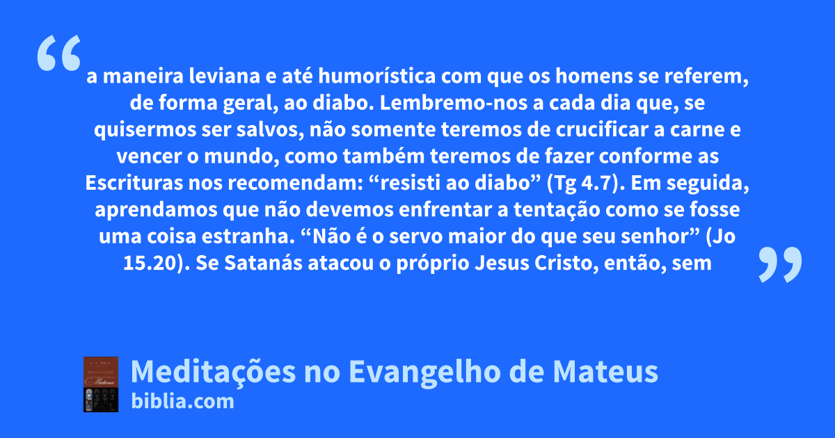 a maneira leviana e até humorística com que os homens se referem, de forma geral, ao diabo. Lembremo-nos a cada dia que, se quisermos ser salvos, não somente teremos de crucificar a carne e vencer o mundo, como também teremos de fazer conforme as Escrituras nos recomendam: “resisti ao diabo” (Tg 4.7). Em seguida, aprendamos que não devemos enfrentar a tentação como se fosse uma coisa estranha. “Não é o servo maior do que seu senhor” (Jo 15.20). Se Satanás atacou o próprio Jesus Cristo, então, sem