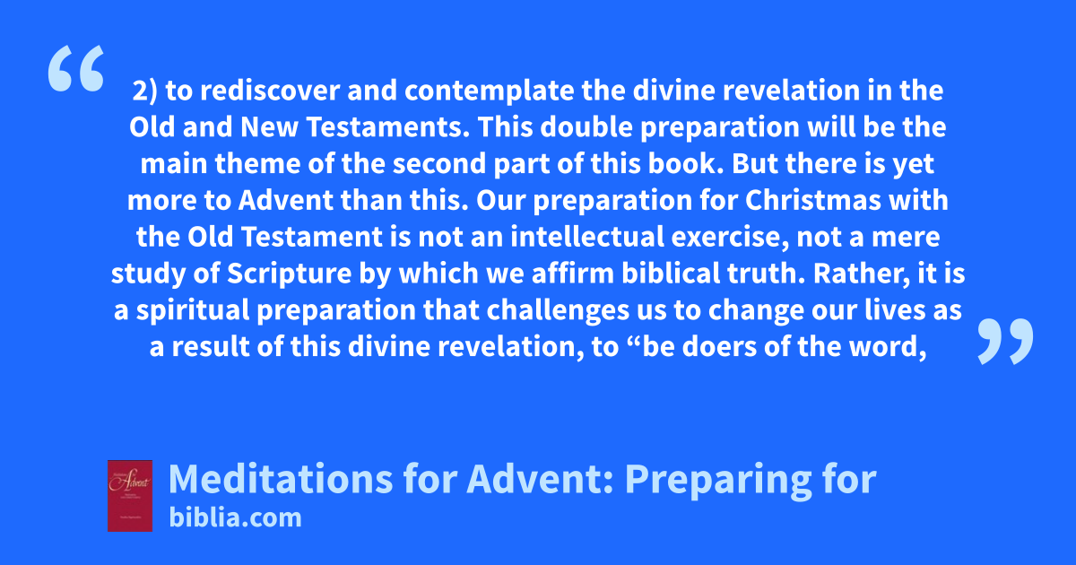 2) to rediscover and contemplate the divine revelation in the Old and New Testaments. This double preparation will be the main theme of the second part of this book. But there is yet more to Advent than this. Our preparation for Christmas with the Old Testament is not an intellectual exercise, not a mere study of Scripture by which we affirm biblical truth. Rather, it is a spiritual preparation that challenges us to change our lives as a result of this divine revelation, to “be doers of the word,