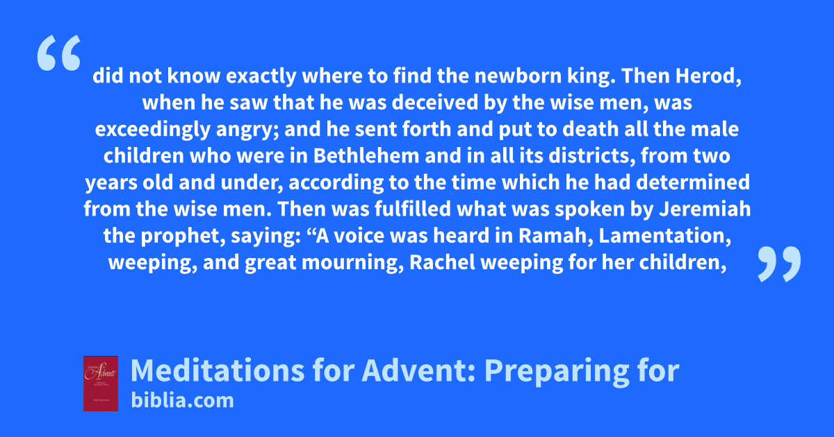 did not know exactly where to find the newborn king. Then Herod, when he saw that he was deceived by the wise men, was exceedingly angry; and he sent forth and put to death all the male children who were in Bethlehem and in all its districts, from two years old and under, according to the time which he had determined from the wise men. Then was fulfilled what was spoken by Jeremiah the prophet, saying: “A voice was heard in Ramah, Lamentation, weeping, and great mourning, Rachel weeping for her children,