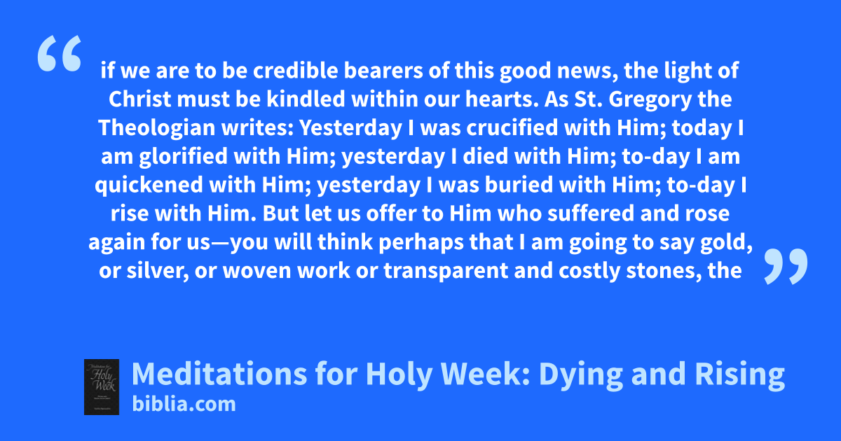 if we are to be credible bearers of this good news, the light of Christ must be kindled within our hearts. As St. Gregory the Theologian writes: Yesterday I was crucified with Him; today I am glorified with Him; yesterday I died with Him; to-day I am quickened with Him; yesterday I was buried with Him; to-day I rise with Him. But let us offer to Him who suffered and rose again for us—you will think perhaps that I am going to say gold, or silver, or woven work or transparent and costly stones, the