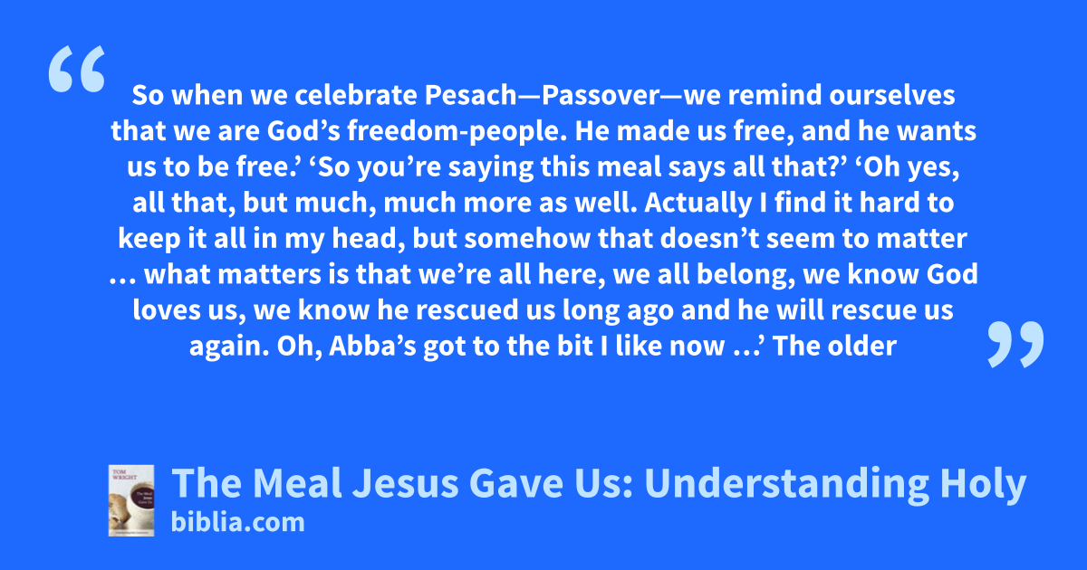 So when we celebrate Pesach—Passover—we remind ourselves that we are God’s freedom-people. He made us free, and he wants us to be free.’ ‘So you’re saying this meal says all that?’ ‘Oh yes, all that, but much, much more as well. Actually I find it hard to keep it all in my head, but somehow that doesn’t seem to matter … what matters is that we’re all here, we all belong, we know God loves us, we know he rescued us long ago and he will rescue us again. Oh, Abba’s got to the bit I like now …’ The older