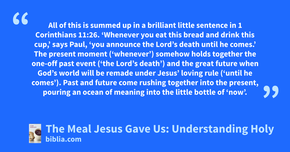 All of this is summed up in a brilliant little sentence in 1 Corinthians 11:26. ‘Whenever you eat this bread and drink this cup,’ says Paul, ‘you announce the Lord’s death until he comes.’ The present moment (‘whenever’) somehow holds together the one-off past event (‘the Lord’s death’) and the great future when God’s world will be remade under Jesus’ loving rule (‘until he comes’). Past and future come rushing together into the present, pouring an ocean of meaning into the little bottle of ‘now’.