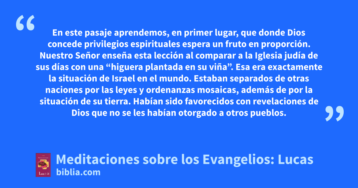 En este pasaje aprendemos, en primer lugar, que donde Dios concede privilegios espirituales espera un fruto en proporción. Nuestro Señor enseña esta lección al comparar a la Iglesia judía de sus días con una “higuera plantada en su viña”. Esa era exactamente la situación de Israel en el mundo. Estaban separados de otras naciones por las leyes y ordenanzas mosaicas, además de por la situación de su tierra. Habían sido favorecidos con revelaciones de Dios que no se les habían otorgado a otros pueblos.