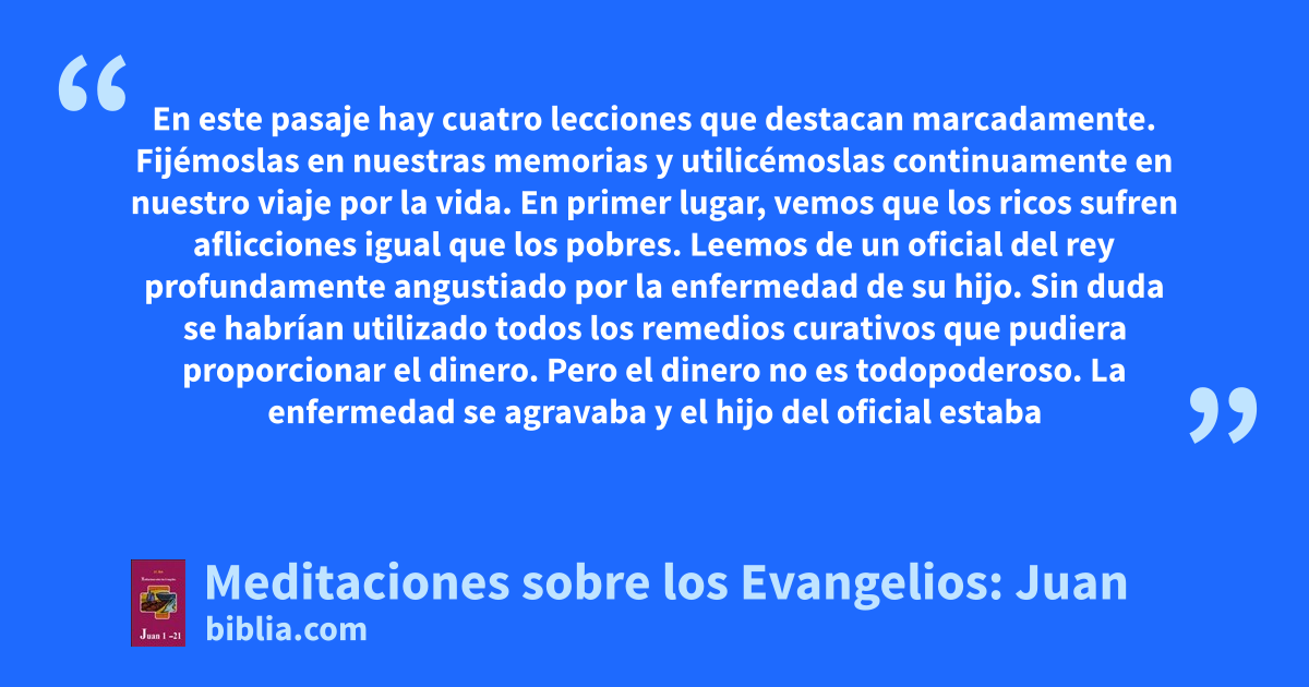 En este pasaje hay cuatro lecciones que destacan marcadamente. Fijémoslas en nuestras memorias y utilicémoslas continuamente en nuestro viaje por la vida. En primer lugar, vemos que los ricos sufren aflicciones igual que los pobres. Leemos de un oficial del rey profundamente angustiado por la enfermedad de su hijo. Sin duda se habrían utilizado todos los remedios curativos que pudiera proporcionar el dinero. Pero el dinero no es todopoderoso. La enfermedad se agravaba y el hijo del oficial estaba