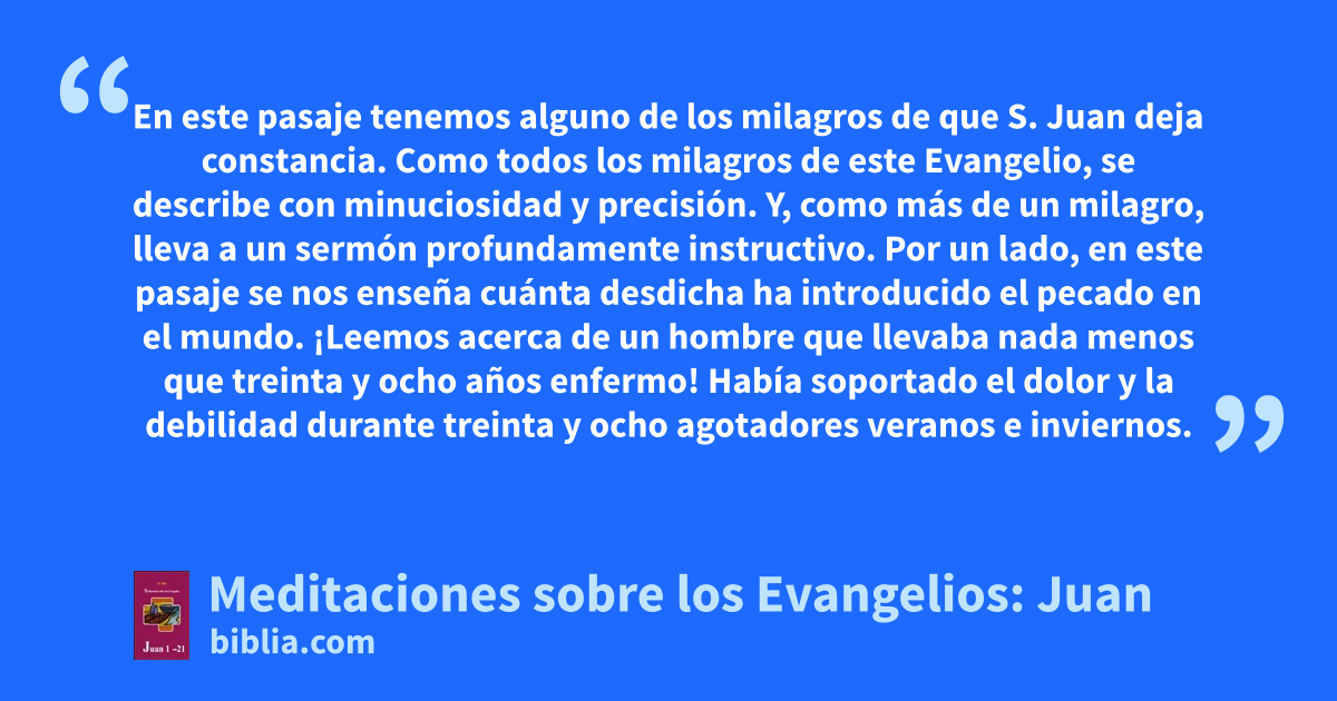 En este pasaje tenemos alguno de los milagros de que S. Juan deja constancia. Como todos los milagros de este Evangelio, se describe con minuciosidad y precisión. Y, como más de un milagro, lleva a un sermón profundamente instructivo. Por un lado, en este pasaje se nos enseña cuánta desdicha ha introducido el pecado en el mundo. ¡Leemos acerca de un hombre que llevaba nada menos que treinta y ocho años enfermo! Había soportado el dolor y la debilidad durante treinta y ocho agotadores veranos e inviernos.