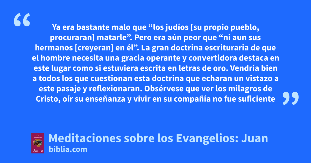 Ya era bastante malo que “los judíos [su propio pueblo, procuraran] matarle”. Pero era aún peor que “ni aun sus hermanos [creyeran] en él”. La gran doctrina escrituraria de que el hombre necesita una gracia operante y convertidora destaca en este lugar como si estuviera escrita en letras de oro. Vendría bien a todos los que cuestionan esta doctrina que echaran un vistazo a este pasaje y reflexionaran. Obsérvese que ver los milagros de Cristo, oír su enseñanza y vivir en su compañía no fue suficiente