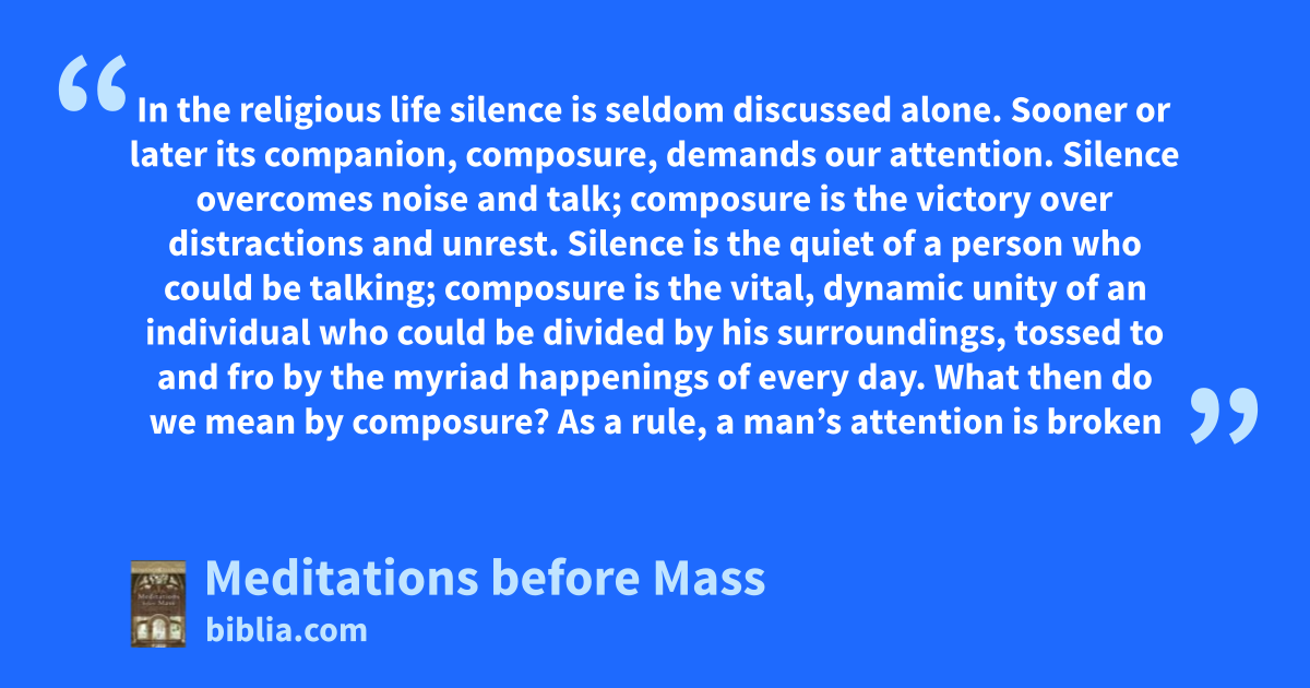 In the religious life silence is seldom discussed alone. Sooner or later its companion, composure, demands our attention. Silence overcomes noise and talk; composure is the victory over distractions and unrest. Silence is the quiet of a person who could be talking; composure is the vital, dynamic unity of an individual who could be divided by his surroundings, tossed to and fro by the myriad happenings of every day. What then do we mean by composure? As a rule, a man’s attention is broken