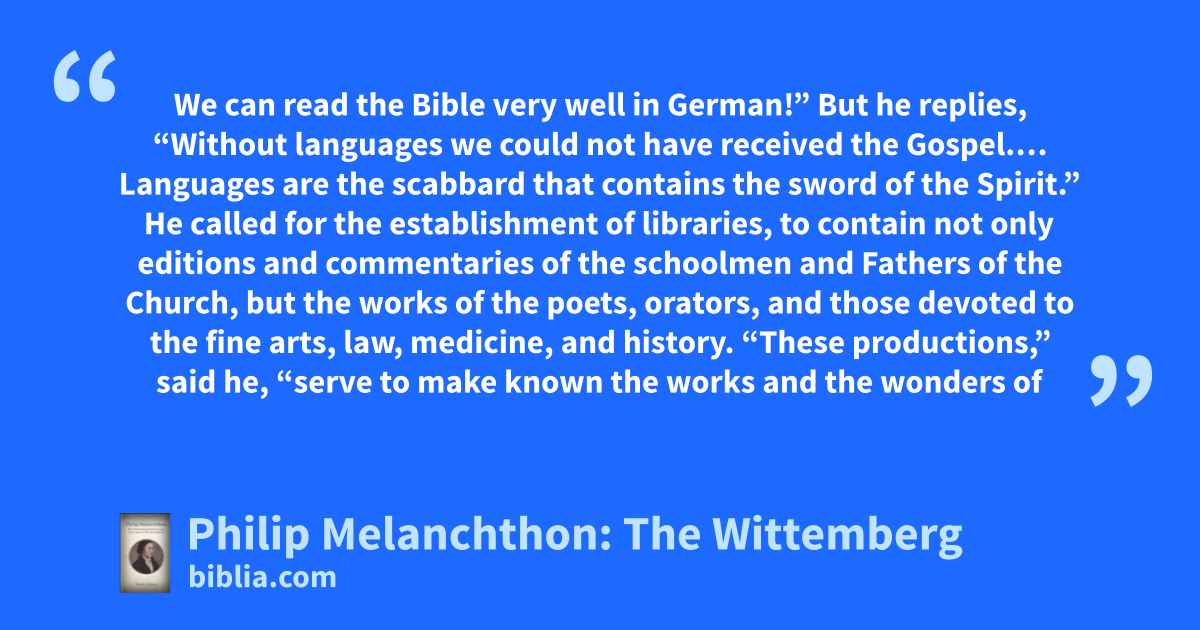 We can read the Bible very well in German!” But he replies, “Without languages we could not have received the Gospel.… Languages are the scabbard that contains the sword of the Spirit.” He called for the establishment of libraries, to contain not only editions and commentaries of the schoolmen and Fathers of the Church, but the works of the poets, orators, and those devoted to the fine arts, law, medicine, and history. “These productions,” said he, “serve to make known the works and the wonders of
