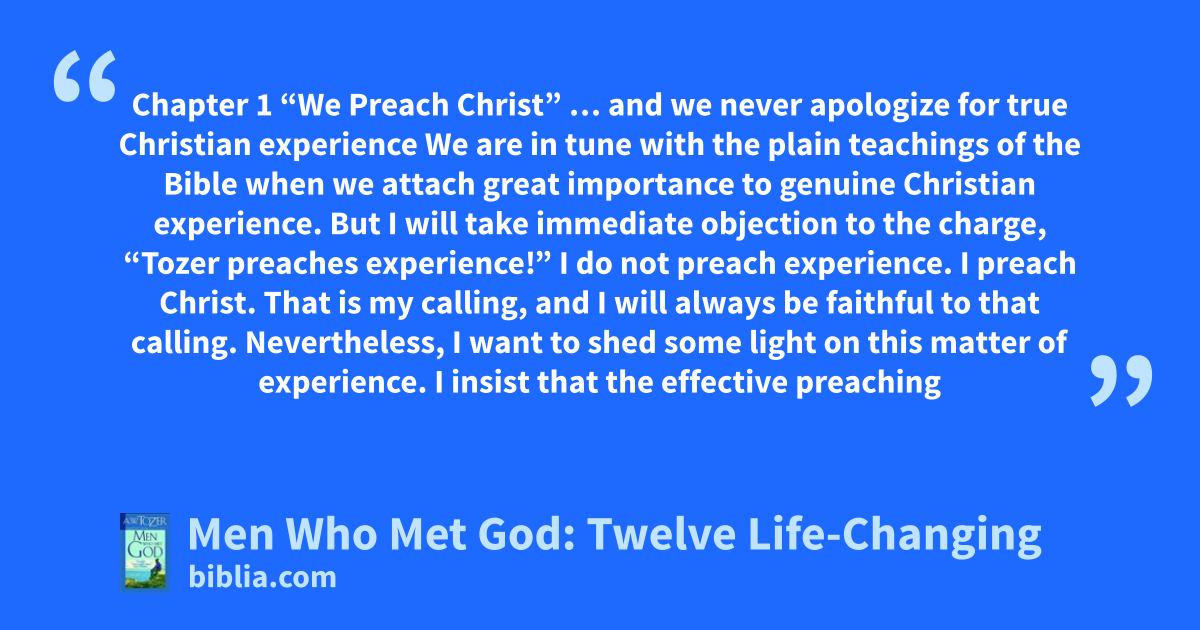 Chapter 1 “We Preach Christ” … and we never apologize for true Christian experience We are in tune with the plain teachings of the Bible when we attach great importance to genuine Christian experience. But I will take immediate objection to the charge, “Tozer preaches experience!” I do not preach experience. I preach Christ. That is my calling, and I will always be faithful to that calling. Nevertheless, I want to shed some light on this matter of experience. I insist that the effective preaching