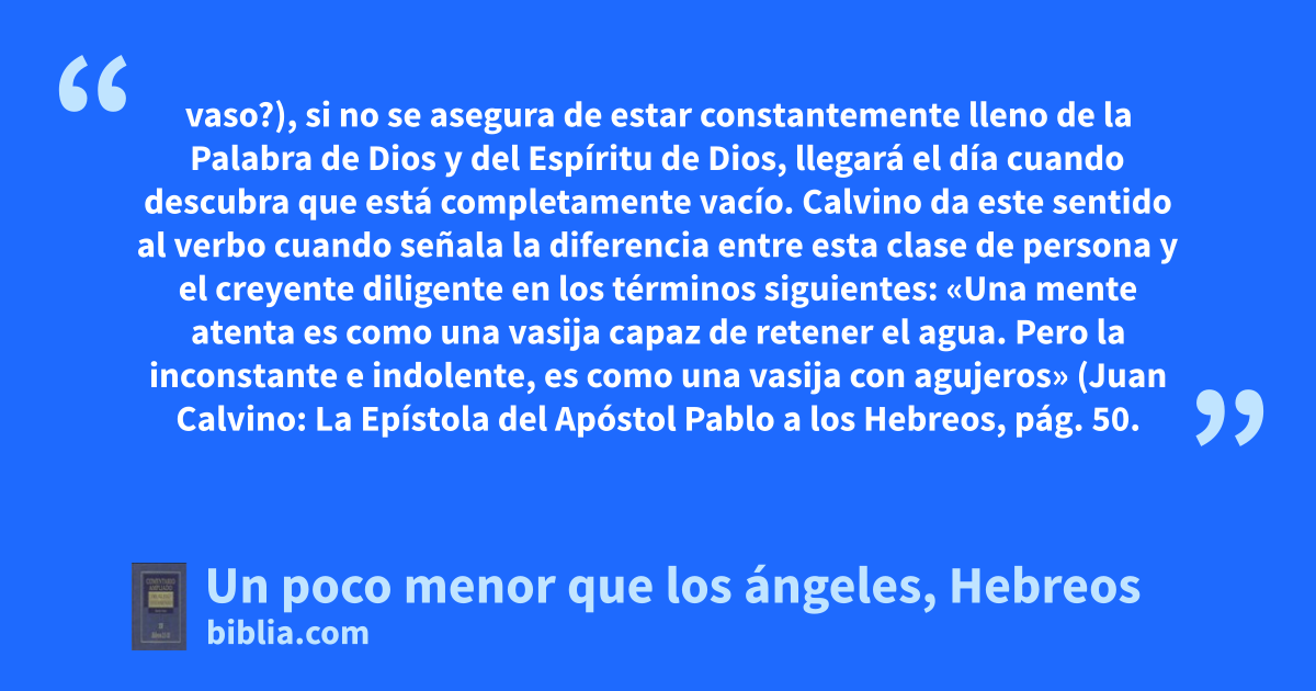 vaso?), si no se asegura de estar constantemente lleno de la Palabra de Dios y del Espíritu de Dios, llegará el día cuando descubra que está completamente vacío. Calvino da este sentido al verbo cuando señala la diferencia entre esta clase de persona y el creyente diligente en los términos siguientes: «Una mente atenta es como una vasija capaz de retener el agua. Pero la inconstante e indolente, es como una vasija con agujeros» (Juan Calvino: La Epístola del Apóstol Pablo a los Hebreos, pág. 50.