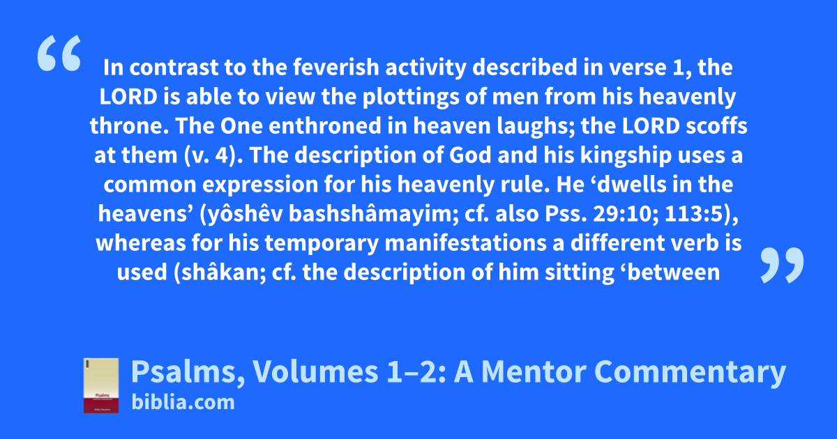 In contrast to the feverish activity described in verse 1, the LORD is able to view the plottings of men from his heavenly throne. The One enthroned in heaven laughs; the LORD scoffs at them (v. 4). The description of God and his kingship uses a common expression for his heavenly rule. He ‘dwells in the heavens’ (yôshêv bashshâmayim; cf. also Pss. 29:10; 113:5), whereas for his temporary manifestations a different verb is used (shâkan; cf. the description of him sitting ‘between