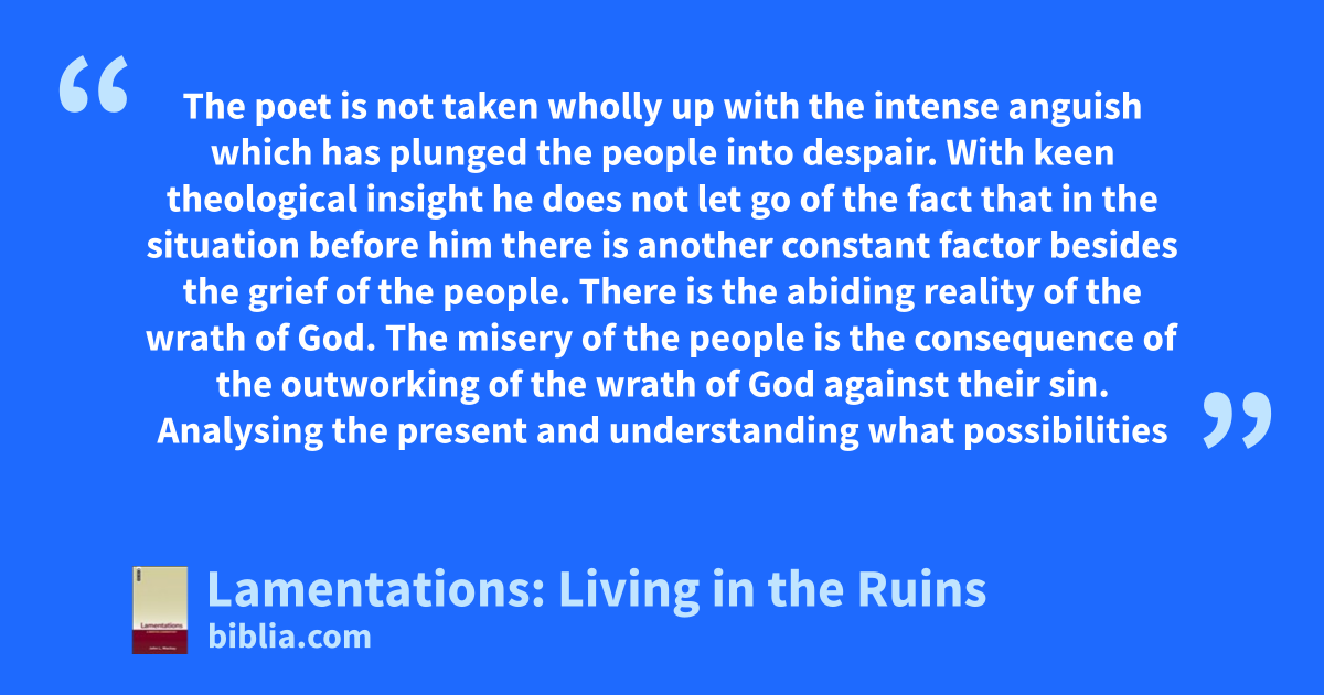 The poet is not taken wholly up with the intense anguish which has plunged the people into despair. With keen theological insight he does not let go of the fact that in the situation before him there is another constant factor besides the grief of the people. There is the abiding reality of the wrath of God. The misery of the people is the consequence of the outworking of the wrath of God against their sin. Analysing the present and understanding what possibilities