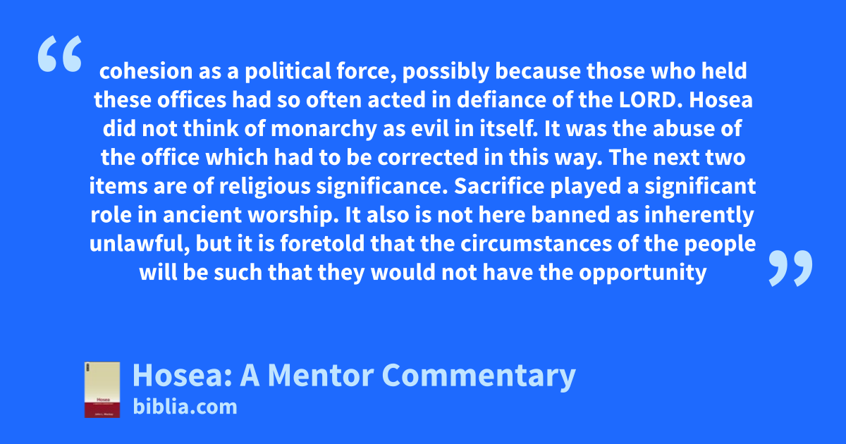 cohesion as a political force, possibly because those who held these offices had so often acted in defiance of the LORD. Hosea did not think of monarchy as evil in itself. It was the abuse of the office which had to be corrected in this way. The next two items are of religious significance. Sacrifice played a significant role in ancient worship. It also is not here banned as inherently unlawful, but it is foretold that the circumstances of the people will be such that they would not have the opportunity