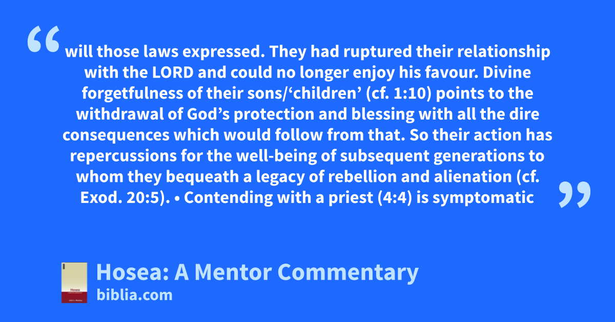 will those laws expressed. They had ruptured their relationship with the LORD and could no longer enjoy his favour. Divine forgetfulness of their sons/‘children’ (cf. 1:10) points to the withdrawal of God’s protection and blessing with all the dire consequences which would follow from that. So their action has repercussions for the well-being of subsequent generations to whom they bequeath a legacy of rebellion and alienation (cf. Exod. 20:5). • Contending with a priest (4:4) is symptomatic