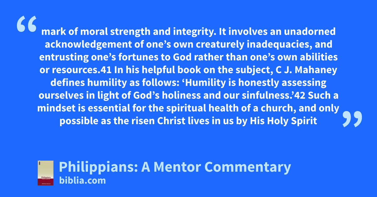 mark of moral strength and integrity. It involves an unadorned acknowledgement of one’s own creaturely inadequacies, and entrusting one’s fortunes to God rather than one’s own abilities or resources.41 In his helpful book on the subject, C J. Mahaney defines humility as follows: ‘Humility is honestly assessing ourselves in light of God’s holiness and our sinfulness.’42 Such a mindset is essential for the spiritual health of a church, and only possible as the risen Christ lives in us by His Holy Spirit