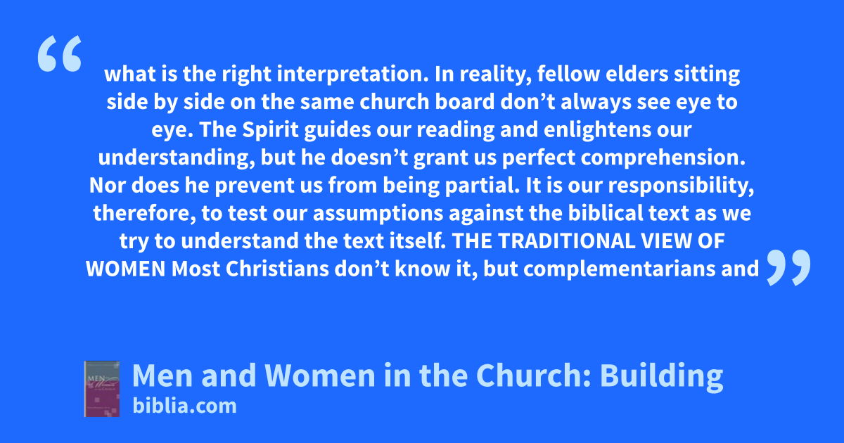 what is the right interpretation. In reality, fellow elders sitting side by side on the same church board don’t always see eye to eye. The Spirit guides our reading and enlightens our understanding, but he doesn’t grant us perfect comprehension. Nor does he prevent us from being partial. It is our responsibility, therefore, to test our assumptions against the biblical text as we try to understand the text itself. THE TRADITIONAL VIEW OF WOMEN Most Christians don’t know it, but complementarians and
