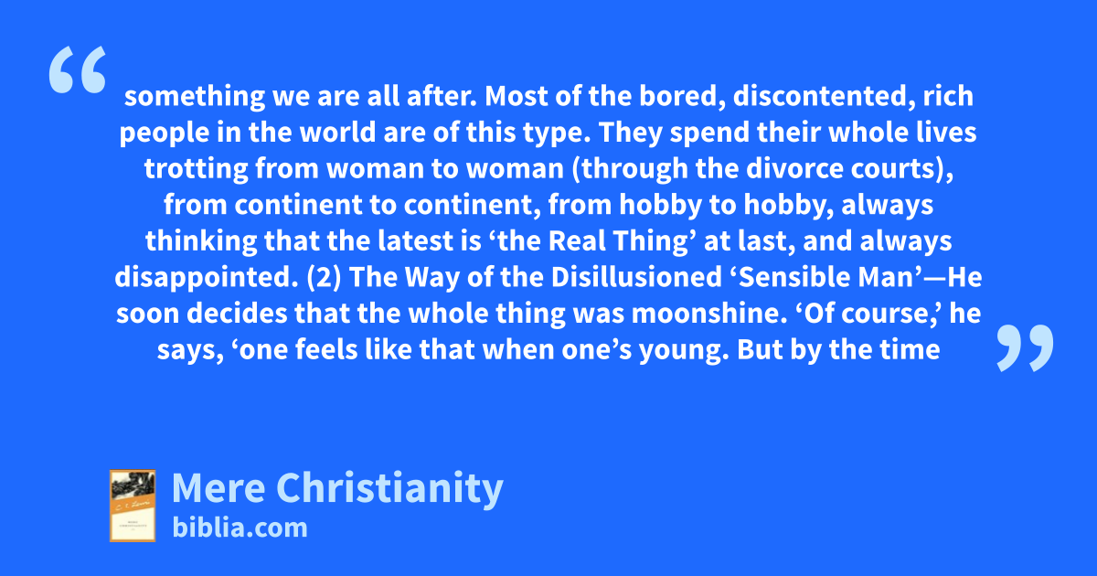 something we are all after. Most of the bored, discontented, rich people in the world are of this type. They spend their whole lives trotting from woman to woman (through the divorce courts), from continent to continent, from hobby to hobby, always thinking that the latest is ‘the Real Thing’ at last, and always disappointed. (2) The Way of the Disillusioned ‘Sensible Man’—He soon decides that the whole thing was moonshine. ‘Of course,’ he says, ‘one feels like that when one’s young. But by the time
