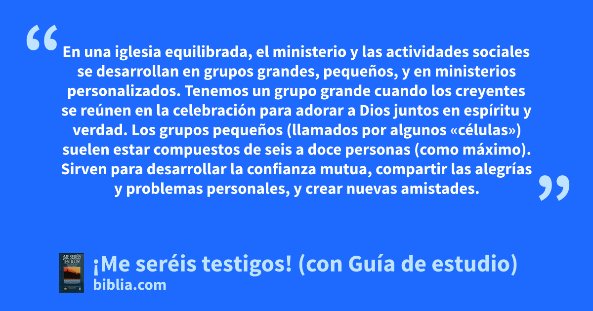 En una iglesia equilibrada, el ministerio y las actividades sociales se desarrollan en grupos grandes, pequeños, y en ministerios personalizados. Tenemos un grupo grande cuando los creyentes se reúnen en la celebración para adorar a Dios juntos en espíritu y verdad. Los grupos pequeños (llamados por algunos «células») suelen estar compuestos de seis a doce personas (como máximo). Sirven para desarrollar la confianza mutua, compartir las alegrías y problemas personales, y crear nuevas amistades.