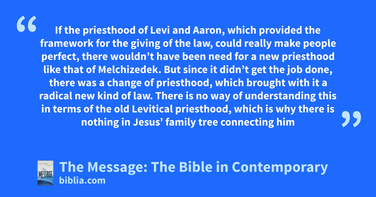 11–14 If the priesthood of Levi and Aaron, which provided the framework for the giving of the law, could really make people perfect, there wouldn’t have been need for a new priesthood like that of Melchizedek. But since it didn’t get the job done, there was a change of priesthood, which brought with it a radical new kind of law. There is no way of understanding this in terms of the old Levitical priesthood, which is why there is nothing in Jesus’ family tree connecting him with that priestly line.