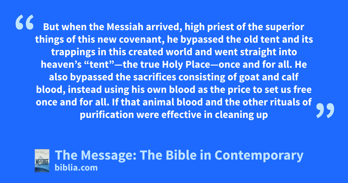 11–15 But when the Messiah arrived, high priest of the superior things of this new covenant, he bypassed the old tent and its trappings in this created world and went straight into heaven’s “tent”—the true Holy Place—once and for all. He also bypassed the sacrifices consisting of goat and calf blood, instead using his own blood as the price to set us free once and for all. If that animal blood and the other rituals of purification were effective in cleaning up certain matters of our religion and behavior, think how much more the blood of Christ cleans up our whole lives, inside and out. Through the Spirit, Christ offered himself as an unblemished sacrifice, freeing us from all those dead-end efforts to make ourselves respectable, so that we can live all out for God.