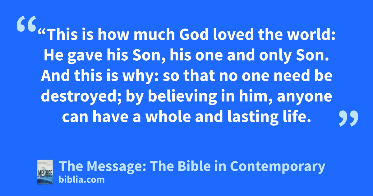 16–18 “This is how much God loved the world: He gave his Son, his one and only Son. And this is why: so that no one need be destroyed; by believing in him, anyone can have a whole and lasting life. God didn’t go to all the trouble of sending his Son merely to point an accusing finger, telling the world how bad it was. He came to help, to put the world right again. Anyone who trusts in him is acquitted; anyone who refuses to trust him has long since been under the death sentence without knowing it. And why? Because of that person’s failure to believe in the one-of-a-kind Son of God when introduced to him.