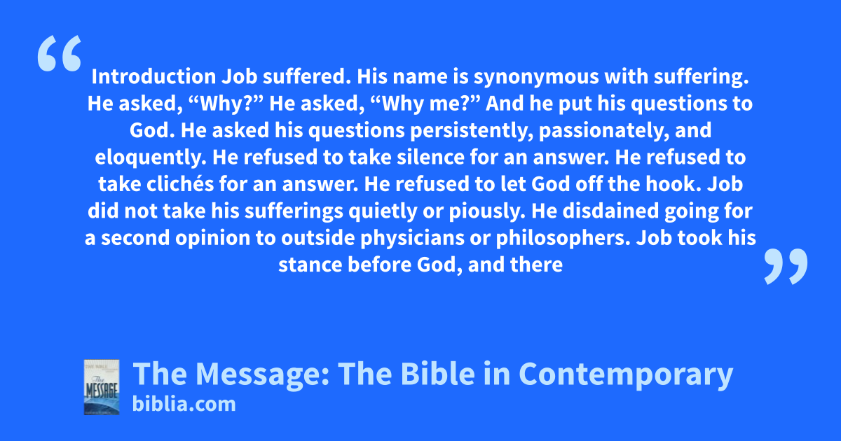 It is not only because Job suffered that he is important to us. It is because he suffered in the same ways that we suffer—in the vital areas of family, personal health, and material things. Job is also important to us because he searchingly questioned and boldly protested his suffering. Indeed, he went “to the top” with his questions.