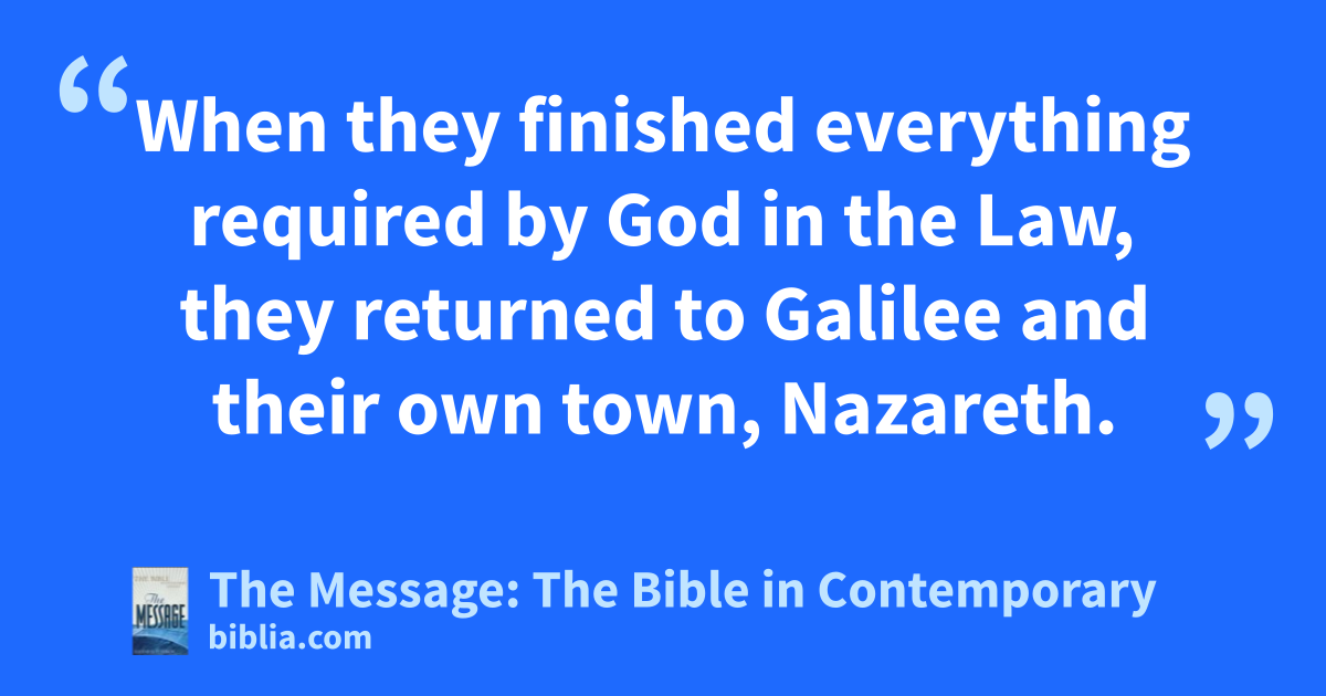 39–40 When they finished everything required by God in the Law, they returned to Galilee and their own town, Nazareth. There the child grew strong in body and wise in spirit. And the grace of God was on him.
