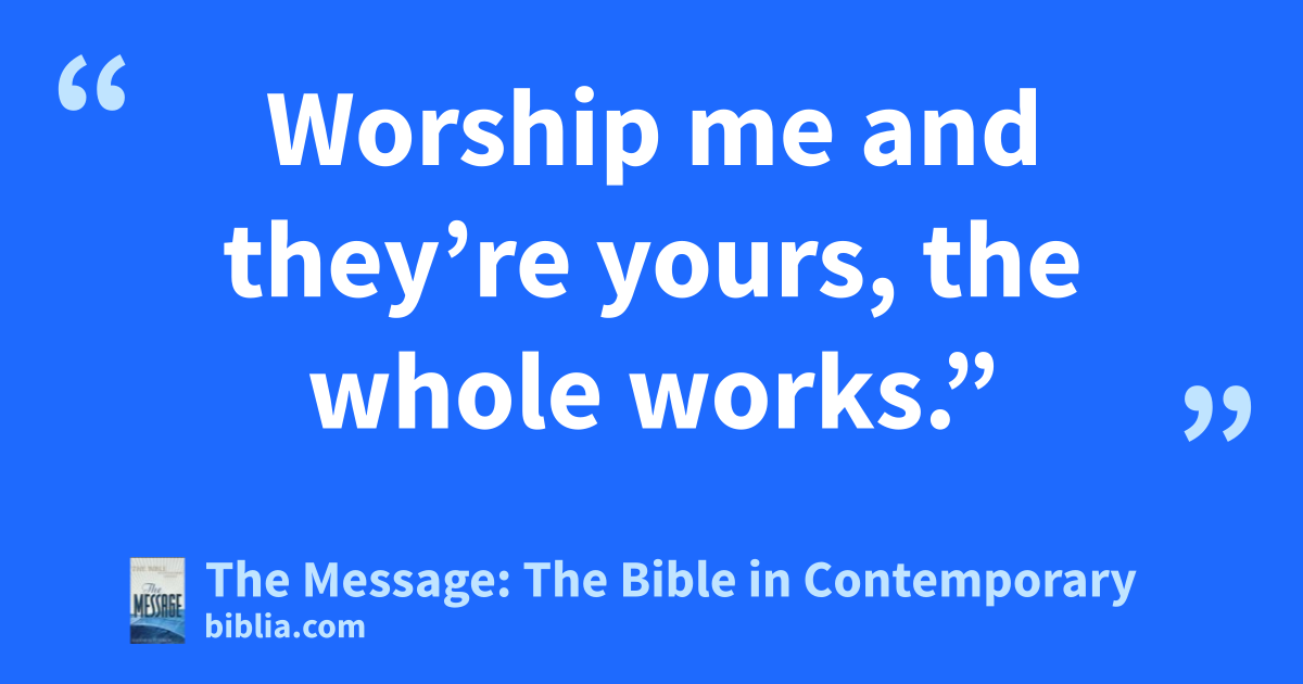 5–7 For the second test he led him up and spread out all the kingdoms of the earth on display at once. Then the Devil said, “They’re yours in all their splendor to serve your pleasure. I’m in charge of them all and can turn them over to whomever I wish. Worship me and they’re yours, the whole works.”