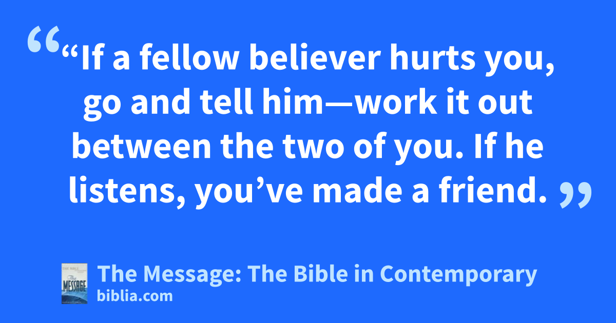 15–17 “If a fellow believer hurts you, go and tell him—work it out between the two of you. If he listens, you’ve made a friend. If he won’t listen, take one or two others along so that the presence of witnesses will keep things honest, and try again. If he still won’t listen, tell the church. If he won’t listen to the church, you’ll have to start over from scratch, confront him with the need for repentance, and offer again God’s forgiving love.