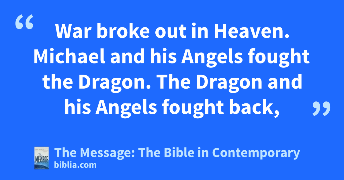 7–12 War broke out in Heaven. Michael and his Angels fought the Dragon. The Dragon and his Angels fought back, but were no match for Michael. They were cleared out of Heaven, not a sign of them left. The great Dragon—ancient Serpent, the one called Devil and Satan, the one who led the whole earth astray—thrown out, and all his Angels thrown out with him, thrown down to earth. Then I heard a strong voice out of Heaven saying,