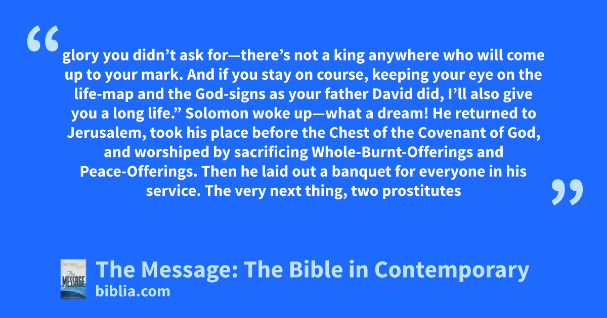 10–14 God, the Master, was delighted with Solomon’s response. And God said to him, “Because you have asked for this and haven’t grasped after a long life, or riches, or the doom of your enemies, but you have asked for the ability to lead and govern well, I’ll give you what you’ve asked for—I’m giving you a wise and mature heart. There’s never been one like you before; and there’ll be no one after. As a bonus, I’m giving you both the wealth and glory you didn’t ask for—there’s not a king anywhere who will come up to your mark. And if you stay on course, keeping your eye on the life-map and the God-signs as your father David did, I’ll also give you a long life.”