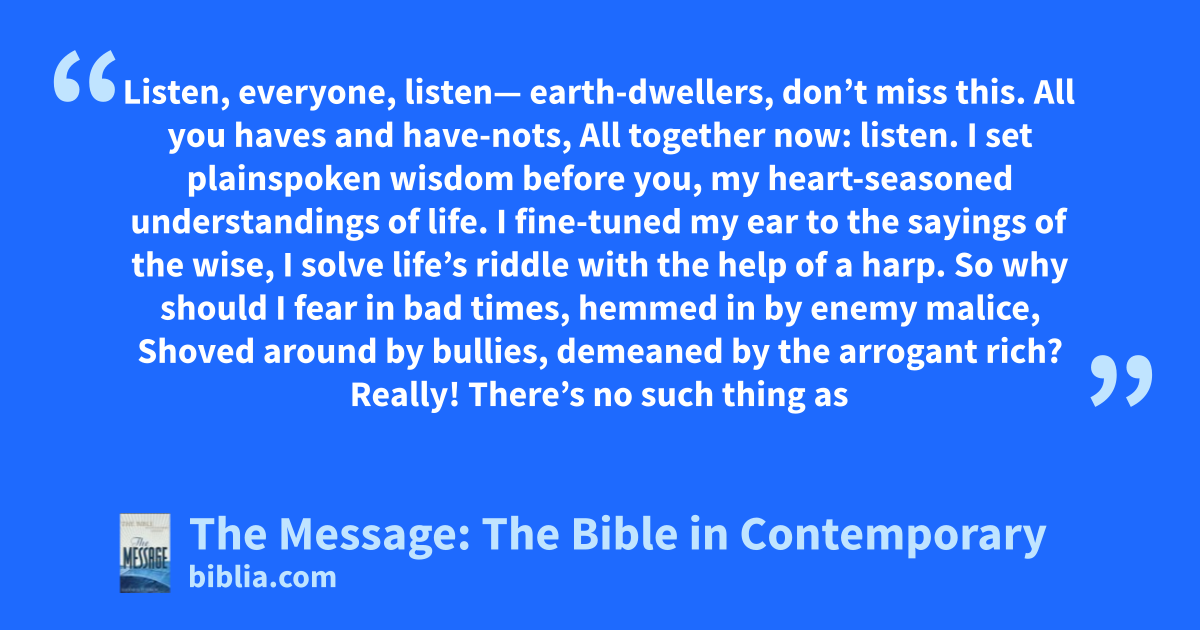 About The Message: The Bible in Contemporary LanguageMany people assume that a book about a holy God should sound elevated, stately, and ceremonial. If this is how you’ve always viewed the Bible, you’re about to make a surprising discovery. The Message brings the life-changing power of the New Testament, the vibrant passion of the Psalms, and the rich, practical wisdom of Proverbs into easy-to-read modern language that echoes the rhythm and idioms of the original Greek and Hebrew. Written in the same kind of language you’d use to talk with friends, write a letter, or discuss politics, The Message preserves the authentic, earthy flavor and the expressive character of the Bible’s best-loved books. Whether you’ve been reading the Bible for years or are exploring it for the first time, The Message will startle and surprise you. And it will allow you to experience firsthand the same power and directness that motivated its original readers to change the course of history so many centuries ago. |
