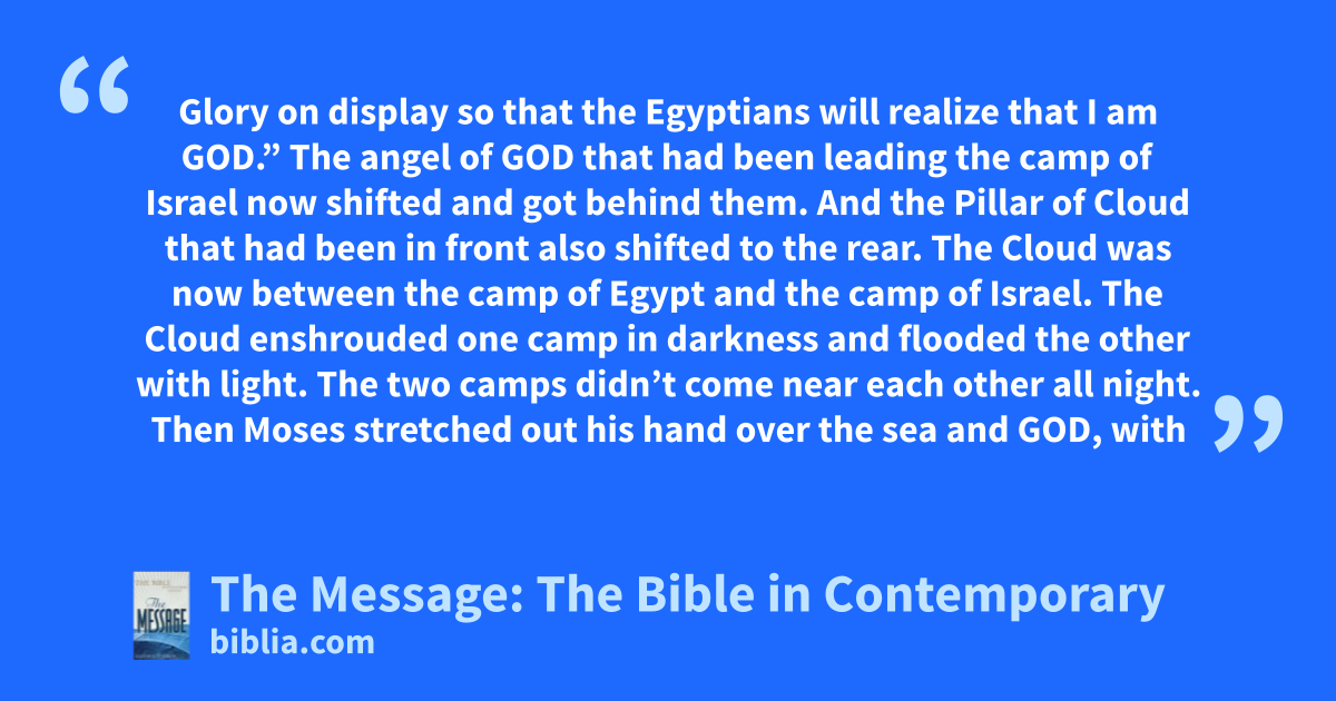 22–25 The Israelites walked through the sea on dry ground with the waters a wall to the right and to the left. The Egyptians came after them in full pursuit, every horse and chariot and driver of Pharaoh racing into the middle of the sea. It was now the morning watch. God looked down from the Pillar of Fire and Cloud on the Egyptian army and threw them into a panic. He clogged the wheels of their chariots; they were stuck in the mud.