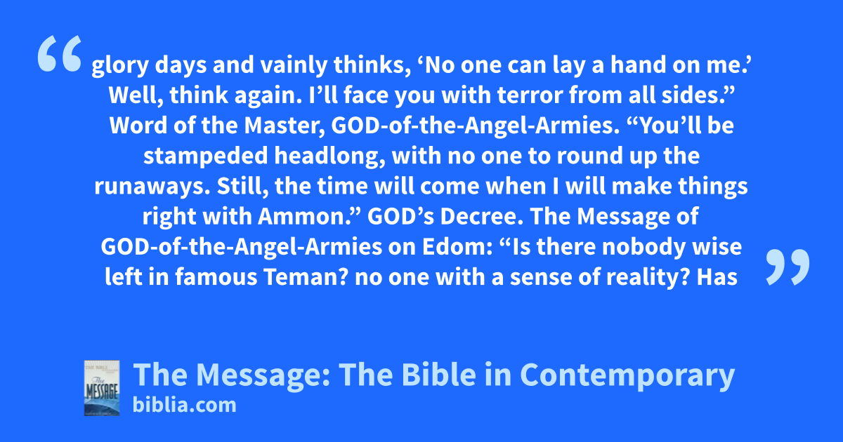 20–22 So, listen to this plan that God has worked out against Edom, the blueprint of what he’s prepared for those who live in Teman: