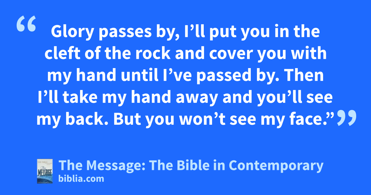 21–23 God said, “Look, here is a place right beside me. Put yourself on this rock. When my Glory passes by, I’ll put you in the cleft of the rock and cover you with my hand until I’ve passed by. Then I’ll take my hand away and you’ll see my back. But you won’t see my face.”