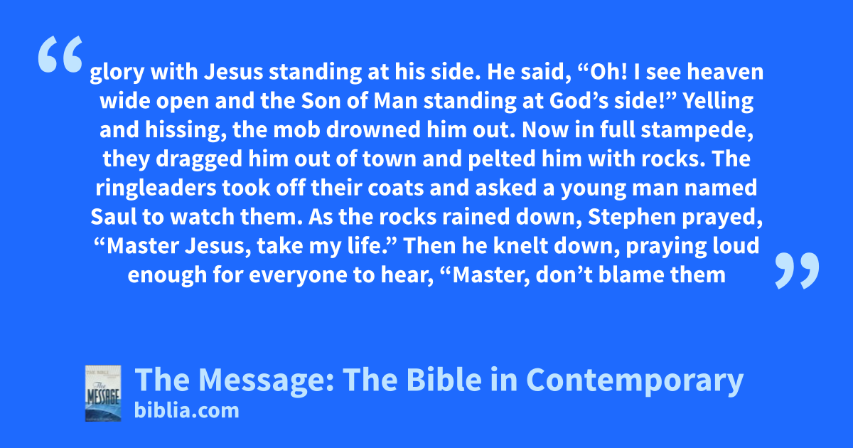 59–60 As the rocks rained down, Stephen prayed, “Master Jesus, take my life.” Then he knelt down, praying loud enough for everyone to hear, “Master, don’t blame them for this sin”—his last words. Then he died.