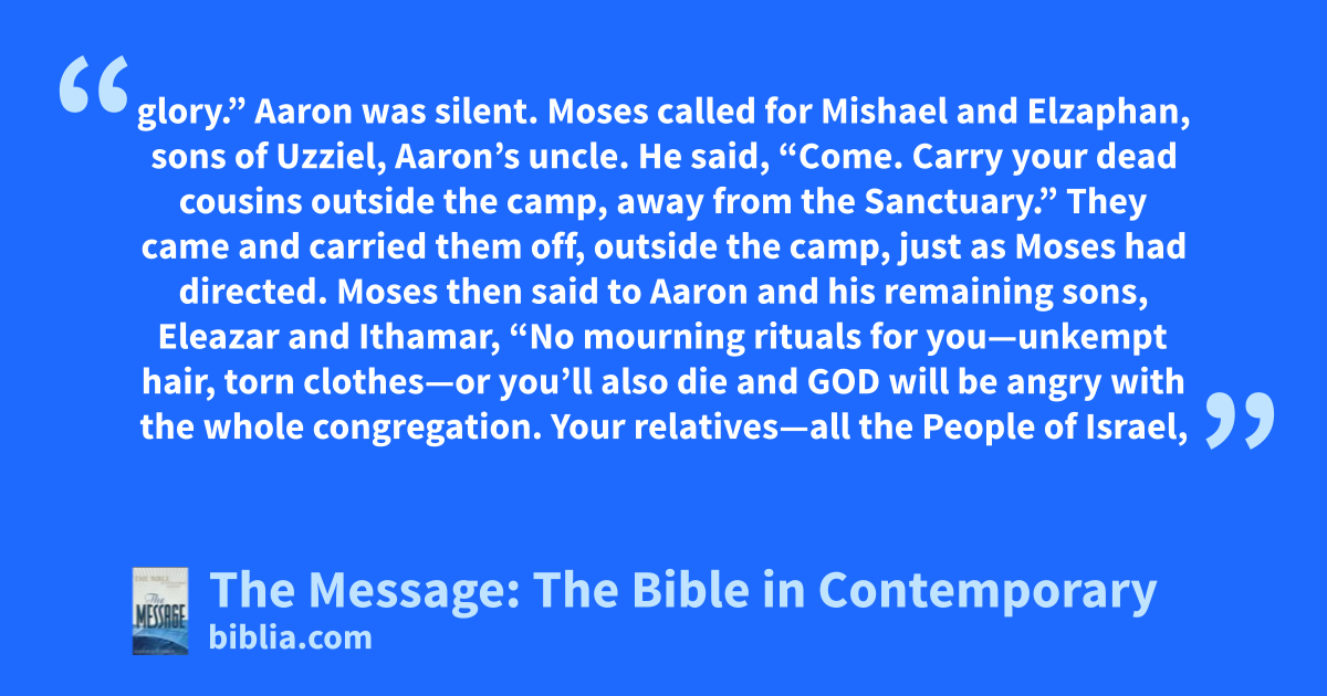 4–5 Moses called for Mishael and Elzaphan, sons of Uzziel, Aaron’s uncle. He said, “Come. Carry your dead cousins outside the camp, away from the Sanctuary.” They came and carried them off, outside the camp, just as Moses had directed.