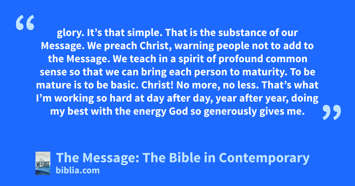 26–29 This mystery has been kept in the dark for a long time, but now it’s out in the open. God wanted everyone, not just Jews, to know this rich and glorious secret inside and out, regardless of their background, regardless of their religious standing. The mystery in a nutshell is just this: Christ is in you, so therefore you can look forward to sharing in God’s glory. It’s that simple. That is the substance of our Message. We preach Christ, warning people not to add to the Message. We teach in a spirit of profound common sense so that we can bring each person to maturity. To be mature is to be basic. Christ! No more, no less. That’s what I’m working so hard at day after day, year after year, doing my best with the energy God so generously gives me.