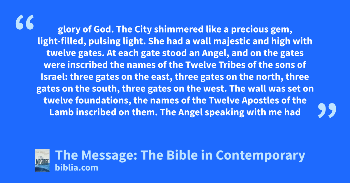 12–14 The City shimmered like a precious gem, light-filled, pulsing light. She had a wall majestic and high with twelve gates. At each gate stood an Angel, and on the gates were inscribed the names of the Twelve Tribes of the sons of Israel: three gates on the east, three gates on the north, three gates on the south, three gates on the west. The wall was set on twelve foundations, the names of the Twelve Apostles of the Lamb inscribed on them.