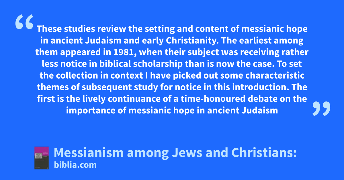 These studies review the setting and content of messianic hope in ancient Judaism and early Christianity. The earliest among them appeared in 1981, when their subject was receiving rather less notice in biblical scholarship than is now the case. To set the collection in context I have picked out some characteristic themes of subsequent study for notice in this introduction. The first is the lively continuance of a time-honoured debate on the importance of messianic hope in ancient Judaism