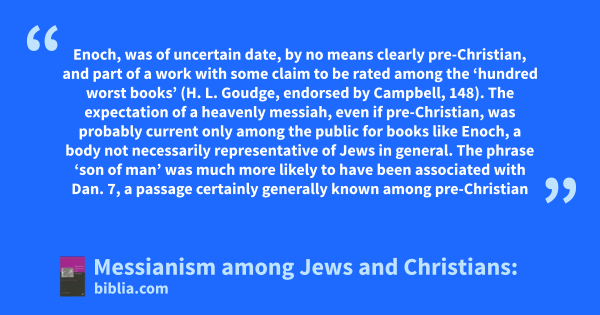 Enoch, was of uncertain date, by no means clearly pre-Christian, and part of a work with some claim to be rated among the ‘hundred worst books’ (H. L. Goudge, endorsed by Campbell, 148). The expectation of a heavenly messiah, even if pre-Christian, was probably current only among the public for books like Enoch, a body not necessarily representative of Jews in general. The phrase ‘son of man’ was much more likely to have been associated with Dan. 7, a passage certainly generally known among pre-Christian