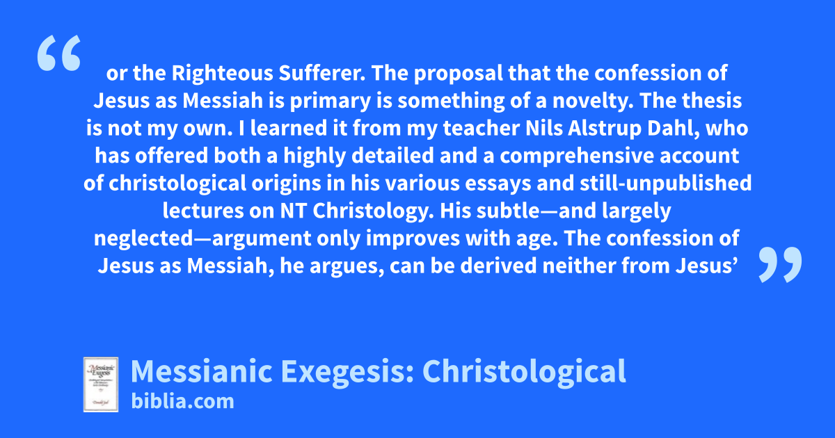 or the Righteous Sufferer. The proposal that the confession of Jesus as Messiah is primary is something of a novelty. The thesis is not my own. I learned it from my teacher Nils Alstrup Dahl, who has offered both a highly detailed and a comprehensive account of christological origins in his various essays and still-unpublished lectures on NT Christology. His subtle—and largely neglected—argument only improves with age. The confession of Jesus as Messiah, he argues, can be derived neither from Jesus’